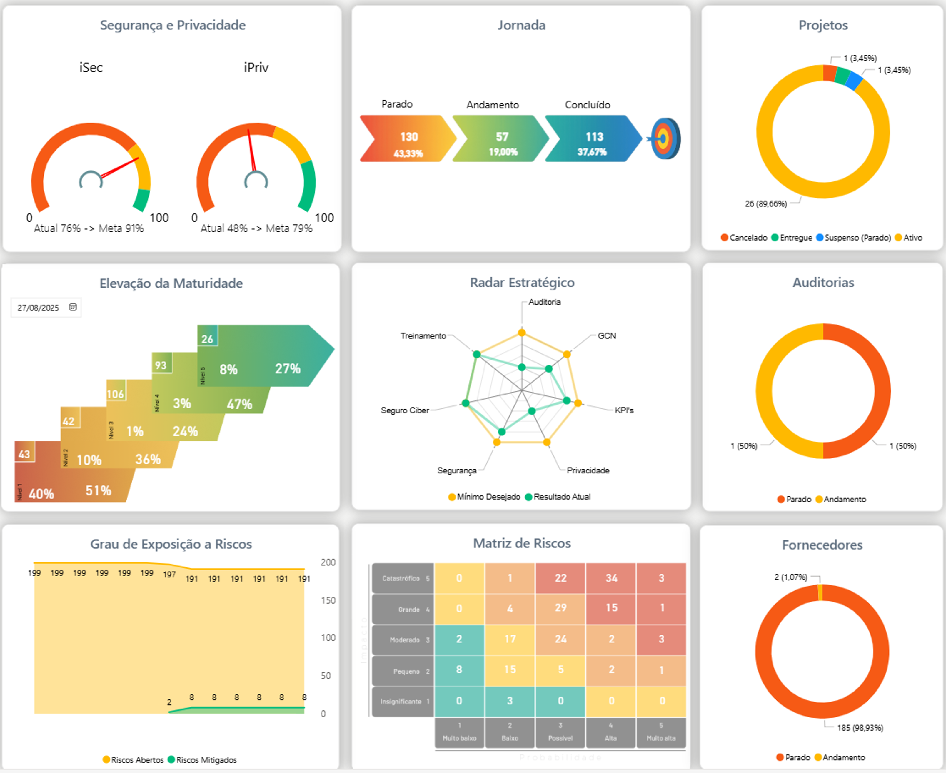 Dashboards executivos com visão 360° de riscos, conformidade e desempenho.